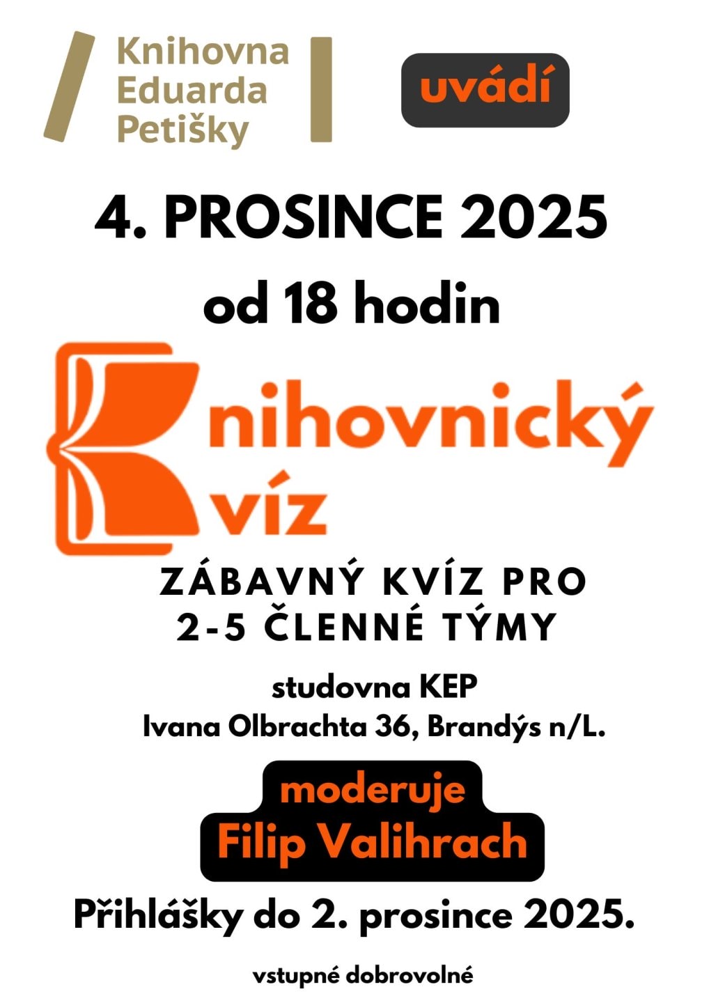 Ve čtvrtek 4. PROSINCE 2025 v 18 hodin startujeme v naší studovně historicky první KNIHOVNICKÝ KVÍZ. Připraveno je 60 otázek z nejrůznějších oblastí – od kultury přes historii až po zajímavosti ze světa. Sestavte s přáteli tým o 2–5 hráčích a užijte si dvě hodiny zábavy v příjemné atmosféře. Kapacita naší studovny je omezená, proto je nutné týmy přihlásit co nejdříve na telefonu 326 907 220 nebo e-mailem na info@knihovna.brandysnl.cz.