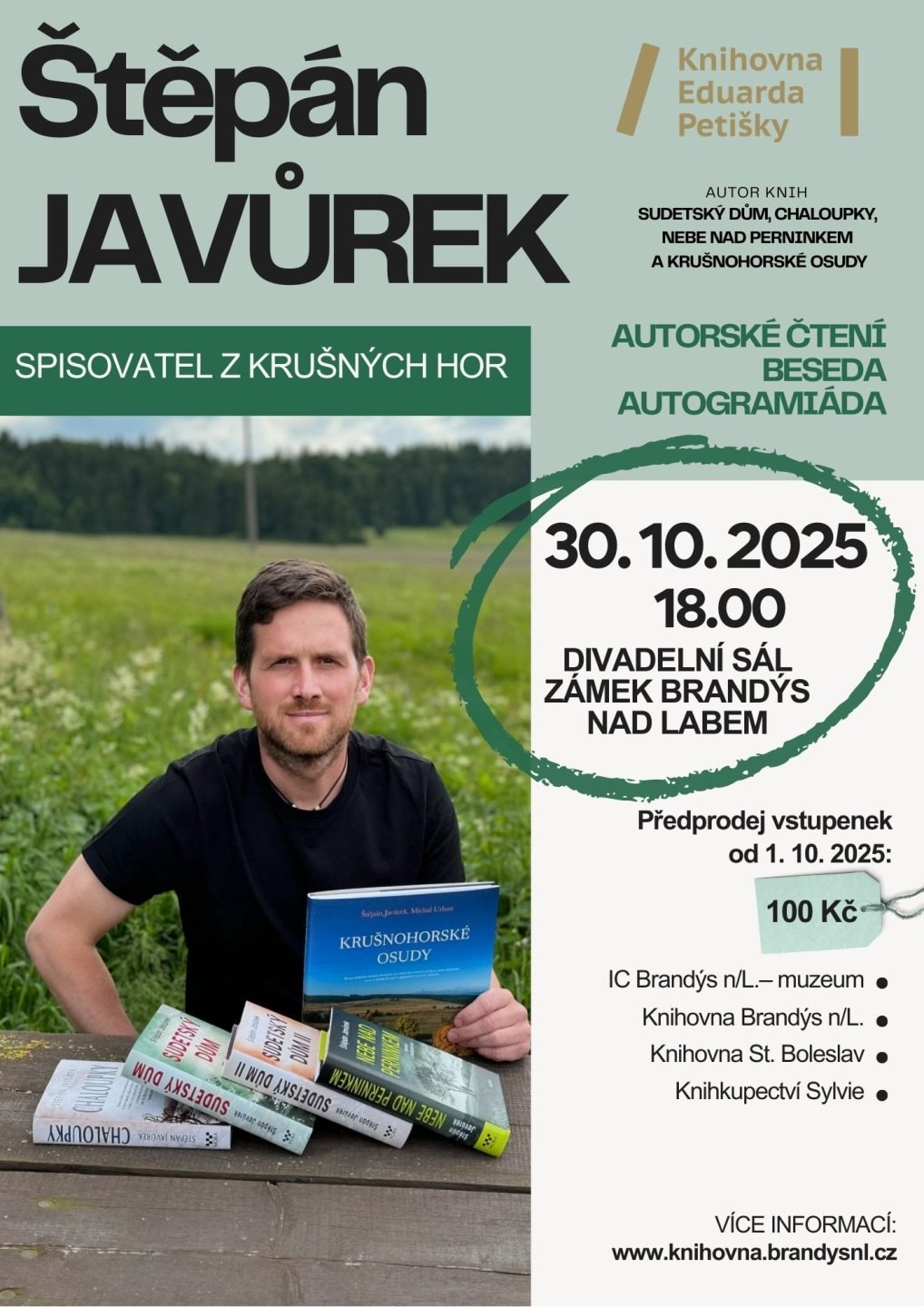 Těšíme se na Vás v divadelním sále brandýského zámku. Předprodej vstupenek (100 Kč) od 1. 10. 2025: Knihovna E. Petišky Brandýs n/L. a Stará Boleslav, Informační centrum v muzeu a Knihkupectví Sylvie.