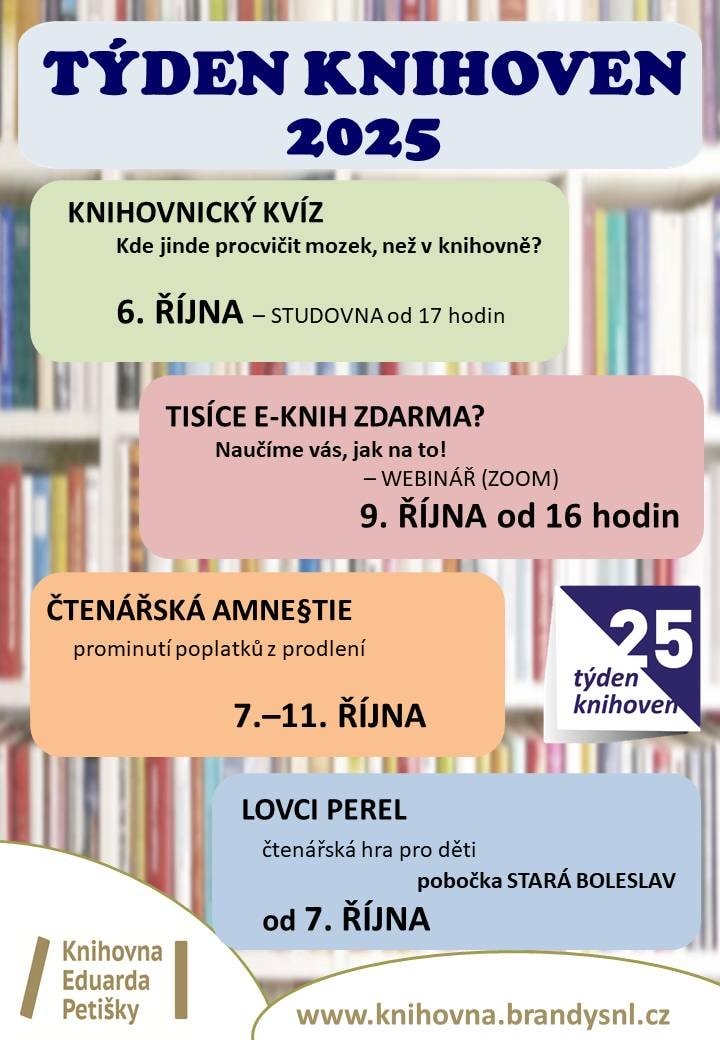 Knihovny mají také svůj svátek. Víte že, po celé ČR je více než šest tisíc knihoven? Slavíme celý týden a slavíme rádi… . V naší knihovně bude probíhat mnoho akcí jak pro děti, tak dospělé nebo seniory. I letos v rámci Týdne knihoven (od 7. 10. do 11. 10. 2025) pořádáme oblíbenou Čtenářskou amnestii - odpuštění poplatků za pozdní vrácení knih. V tomto týdnu můžete vrátit Vámi „dlouho“ vypůjčené knihy bez sankcí. Čtenářská amnestie se netýká knih zapůjčených prostřednictvím MVS (knihy zapůjčené z jiných knihoven v ČR). Týden odstartujeme pondělním Knihovnickým kvízem, od úterka čeká na děti školou povinné na pobočce ve Staré Boleslavi čtenářská hra Lovci perel. Ve čtvrtek se můžete zdarma připojit k webináři: Tisíce e-knih zdarma?, který vás naučí pracovat s digitální knihovnou.